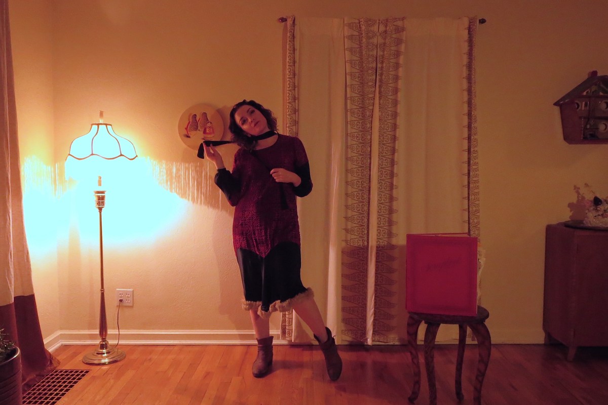 It’s the fin de siecle—and fin de this sick outfit. This will be the last time I ever wear this dress. It’s from the 1920s. Over 100 years old. It’s silk and velvet brocade with tassels and a fur-lined skirt. It’s the most exquisite dress I’ve ever owned. And I’ve owned a lot of exquisite dresses. But the seams rip every time I move....