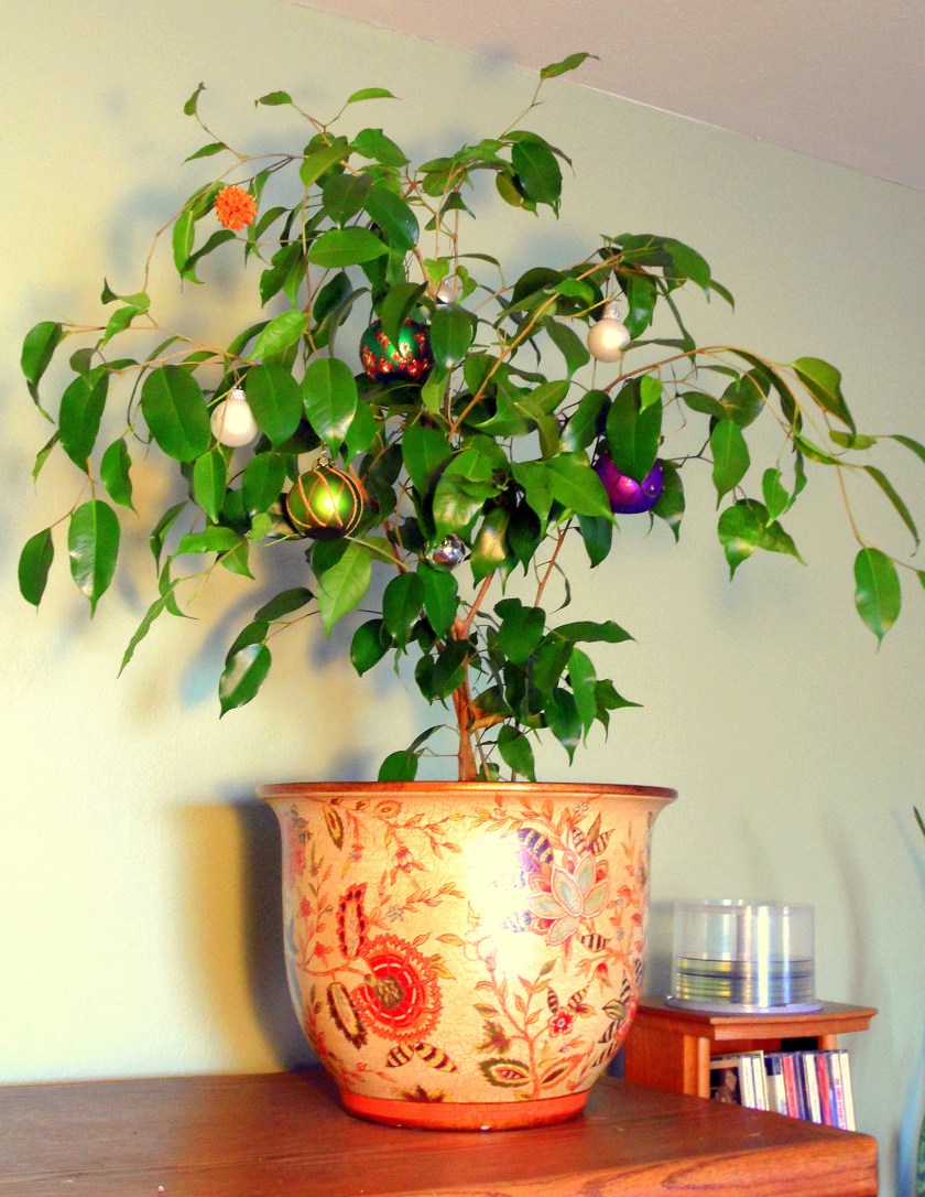 If you have houseplants, you have instant Christmas decor. Put your presents beneath one, and forgo the tree entirely. It’s an easy way to give your house (and plants) a bit of cheer. The vintage-looking ornaments are from TJ Maxx.