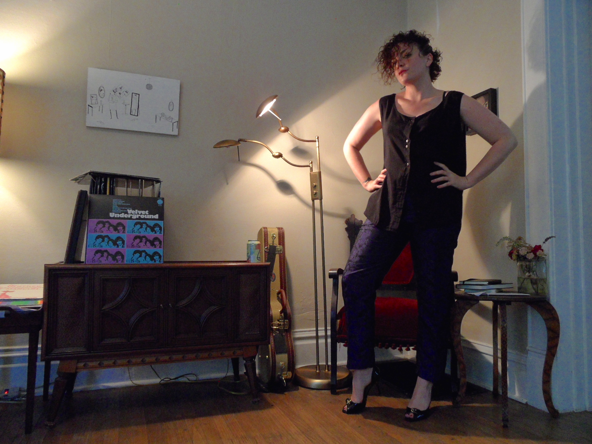 I paired these with a Maggie Lawrence Sport black button up top (circa 1980s) from ReStyle ($3) that I just noticed is size 22/24. Sometimes, too big tops can be sexy-ish, if you button them up halfway, and wind/movement shows off your figure in blasts, and they slip off your shoulders for generous side bra/boob. But sometimes, Jessica might need to clean out her closet. The jury is still out on this one.