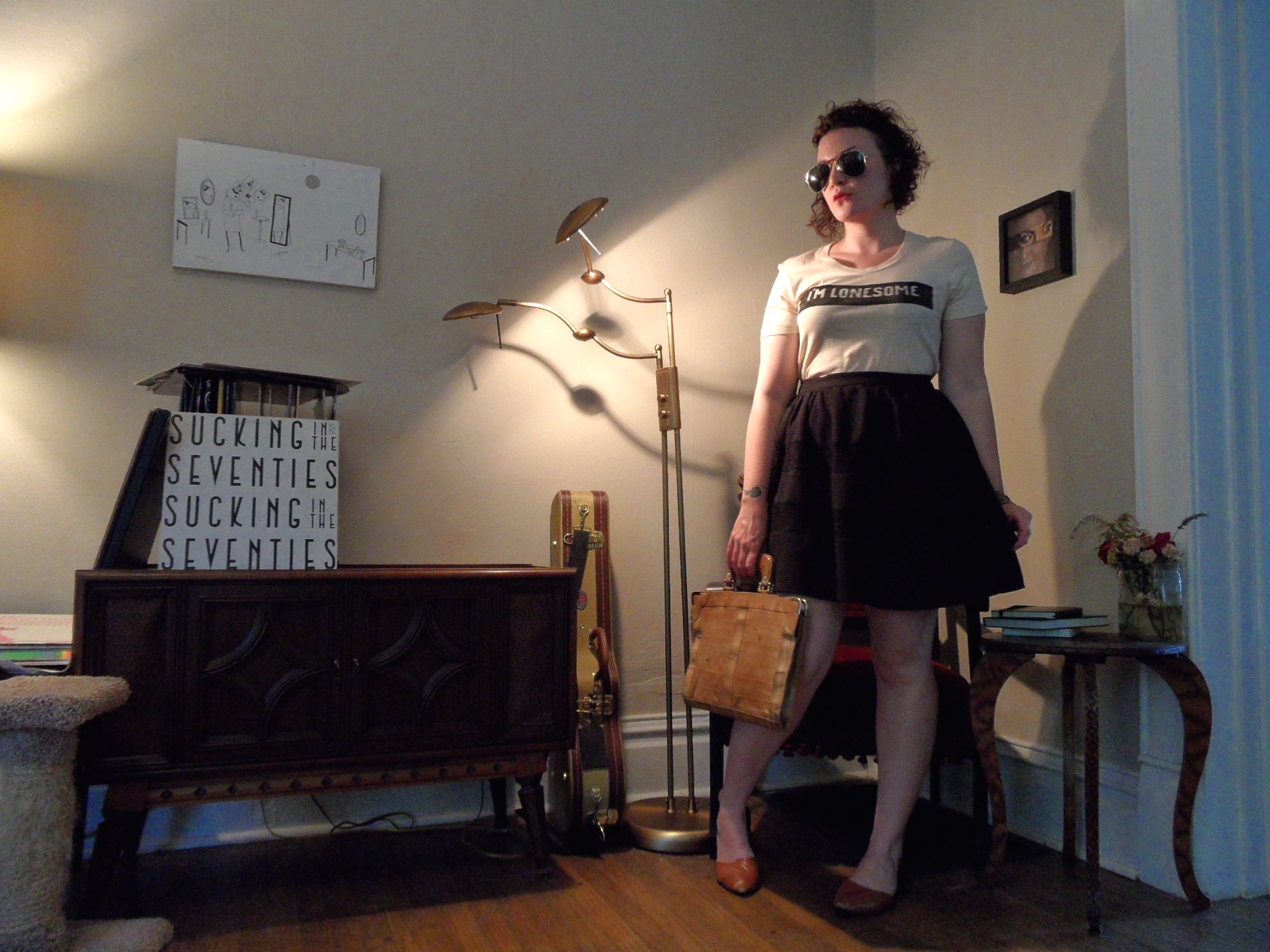 The “I’m Lonesome” flesh-tone t-shirt is by the artist Erin Cunningham, who somehow lives in Boise even though she should be SoHo famous. Her talent is vast, and varied, and she issued these shirts last Christmas-time at a gallery shop (for $25, plus it came with a complimentary mixed-tape burned CD called “Lonesome Times”). As soon as I saw one, I found it hilarious. “Those are on the nose,” the sad clown would say. Erin also did the black-and-white cartoon-style piece featured above my record player. It’s titled “Alone Party.” There might be a running theme here.