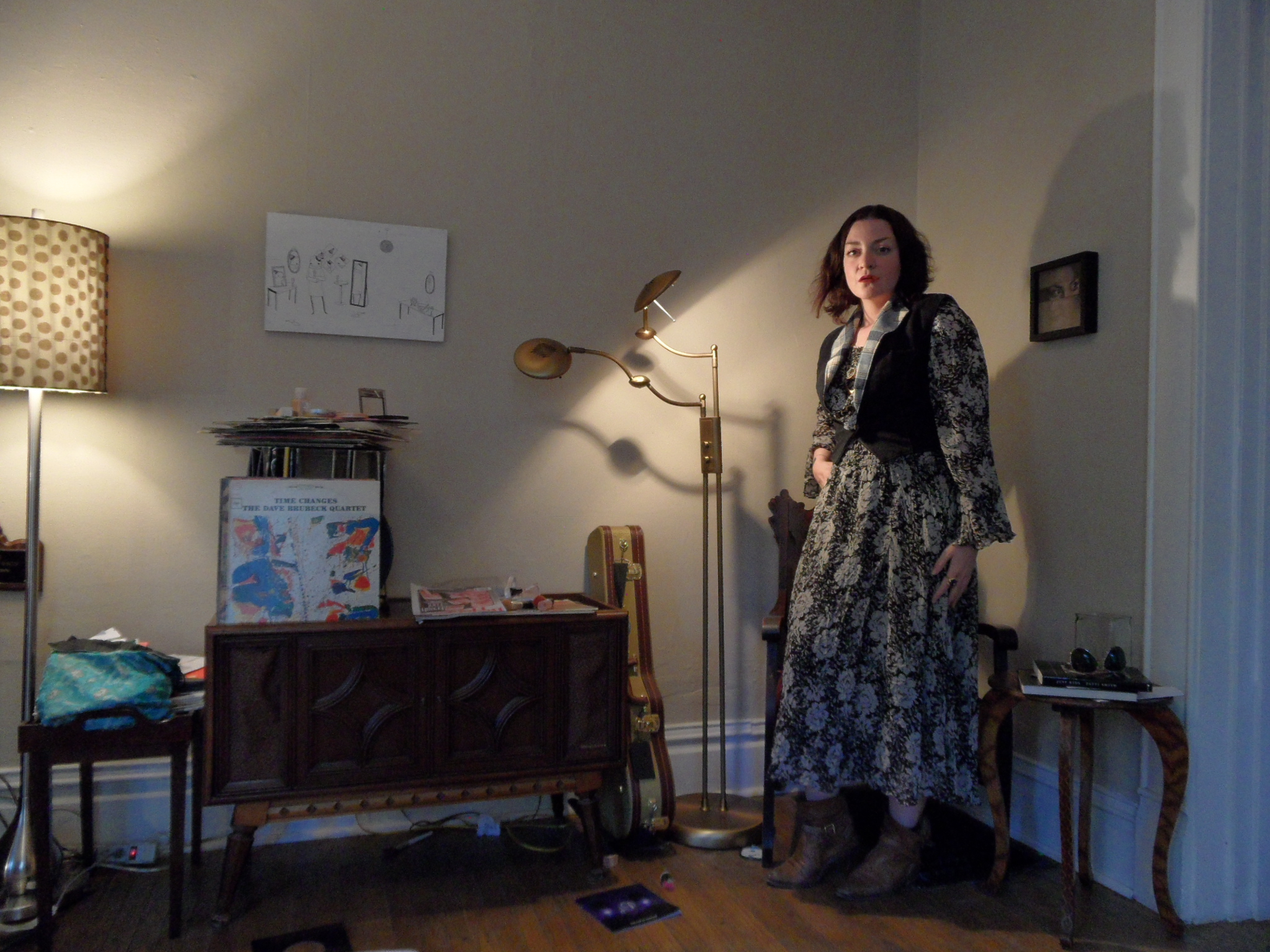 Diane Freis bohemian beaded silk flower print dress (vintage 1980s) – $30, Acquired Again Antiques | Handmade Custom Leatherworks plaid wool & leather vest – $5, Idaho Youth Ranch thrift store | Frye boots – $200 | Geode gold necklace – $54 Bricolage