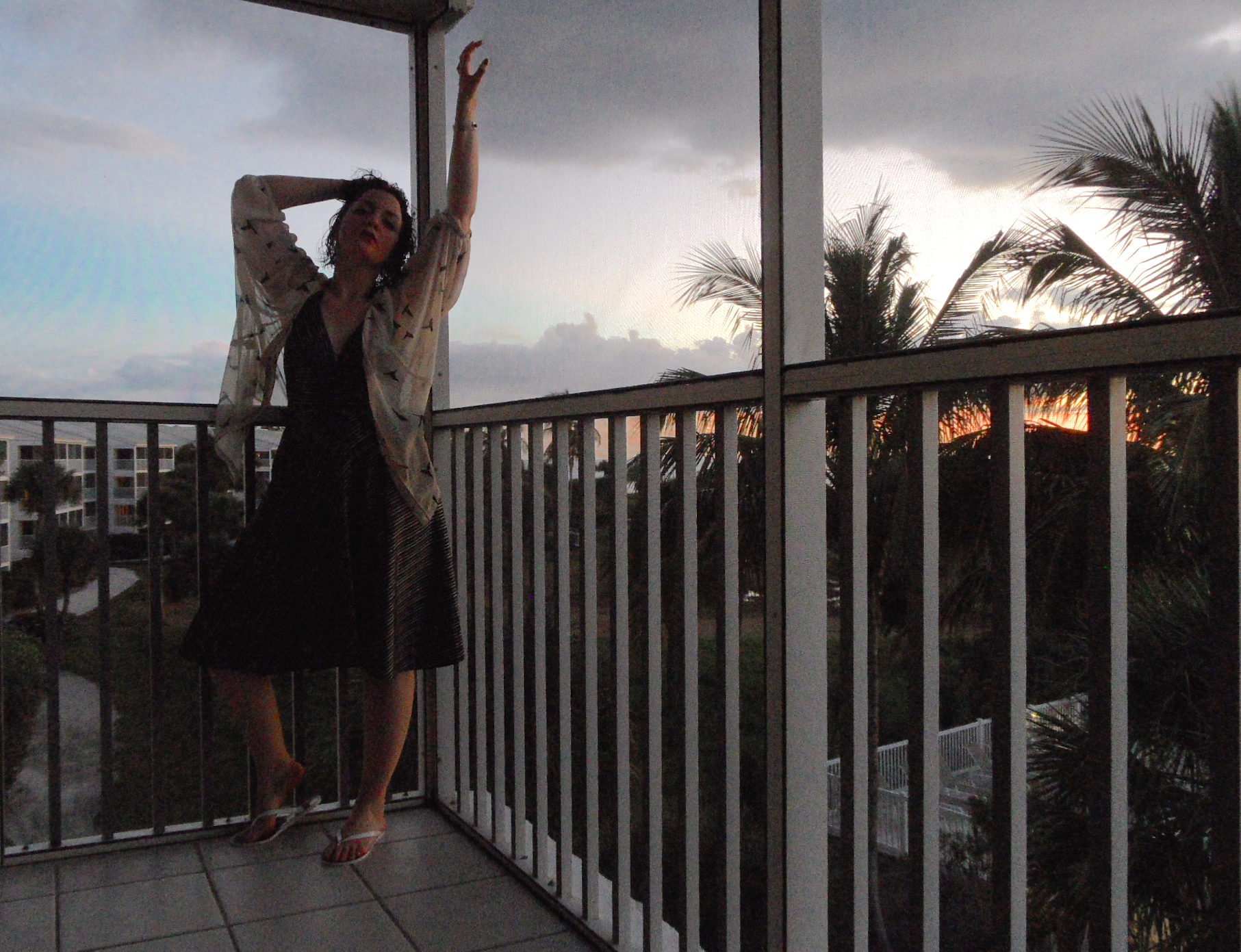 Black-and-white striped tie-string halter dress (that I just realized while digging through my luggage to find the brand that I left hanging on the hook behind the door in the bathroom of the South Seas resort where I took this photo. Goodbye, sweet, captive beauty), $10, LUX Fashion Lounge | Black Rainn sheer bird shirt, $14, Serendipity Boutique | White plastic flip-flops with gold glitter insteps, $2, Grocery Outlet