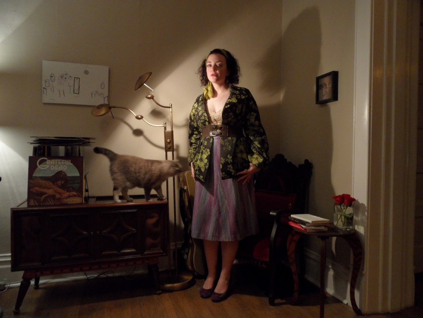 Brown and green silk taffeta jacket (unlabeled) that looks like bark and electric moss (gift) | Acid green silk scarf, ReStyle thrift store, $1 | Banana Republic cream lace camisole, ReStyle, $3 | Glass terrarium necklace with jasper, moss and lavender, Wintry Market, $40. | Leather and elastic brown belt, Idaho Youth Ranch, $2 | Trevira purple and blue skirt (gift) | BCBGeneration purple platforms, Macy’s, $40 (sale!)