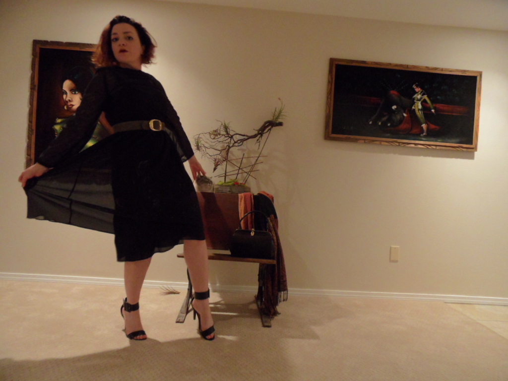 No tag sheer black with subtle deep purple & grey floral print dress w/ black slip – $5, I think, but I can’t remember where I got it | Heart in D black banded 5-inch heels – clothing exchange party, in trade for some seriously strange sequins gowns & tops (so priceless)