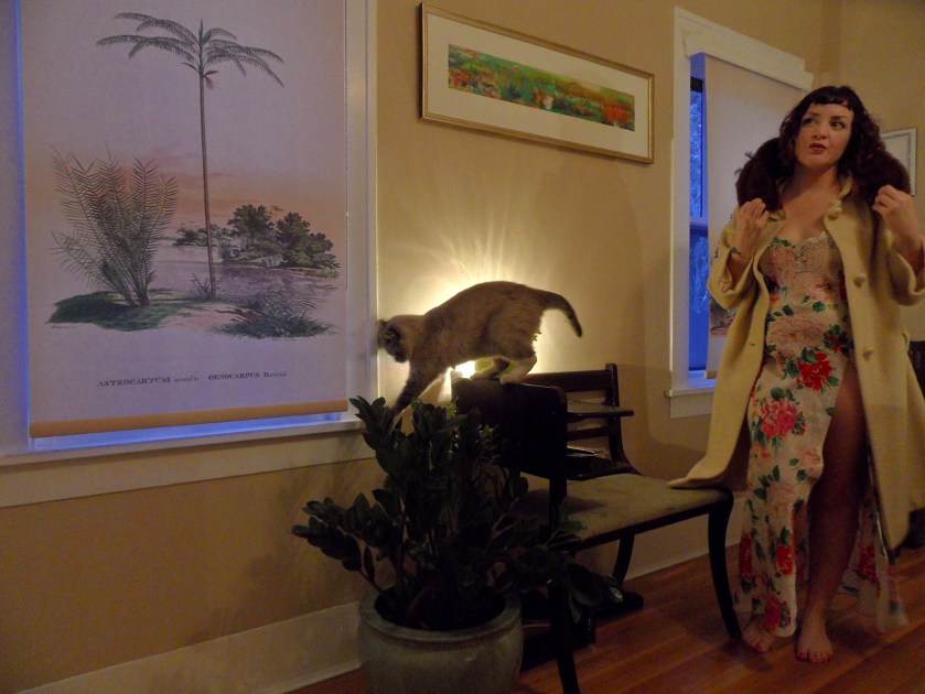 This winter has been unseasonably warm. Not quite naked-outside-in-a-hammock warm but maybe oh-shit-is-this-global-warming? warm or there-would-be-no-balls-shrinking-in-this-polar-bear-plunge warm. Since I won’t be wearing these beautiful wool and fur creations in the wild anytime soon, I showed them off in the spare room I now call the “tropical oasis”—a nome de plumage stemming from the vintage illustrations on these custom-printed blinds I bought from Etsy-Greece. One shade covered the door in my recently-departed apartment. So I got it a companion palm so it wouldn’t feel all deserted-island up in here. The tropical illustrations are from Historia naturalis palmarum—an early 1800s triptych travelogue through Brazil and Peru by a German botanist—illustrated exotically. circa 1960s – no label except for Bolura: Exclusive Fabric from California cream long coat w/ fur collar. (whisper *exlusive*) Christmas gift from Ryan. Victoria’s Secret botanical nightgown w/ lace & pearl details, $5 – ReStyle (I washed it first, OK?) . circa 1970s? – no label black short textured wool coat w/ fake fur collar & cuff. I can’t remember where I got this (Antique World Mall?) but it was …