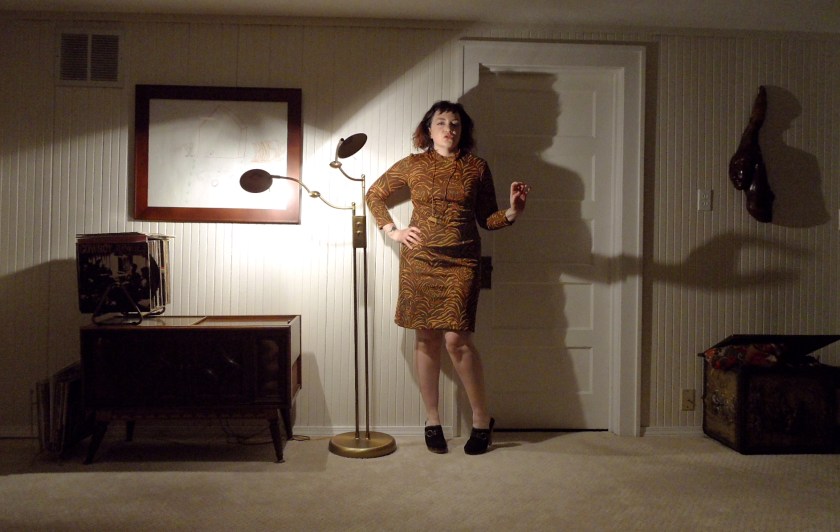 vintage Honeycomb hidden tiger dress, $?, antique store? (Look close for the green eyes of the tigers lookin’ back at you). Ralph Lauren studded black suede & wood high-heeled mules – $5, Good Samaritan thrift store (MSRP $100).