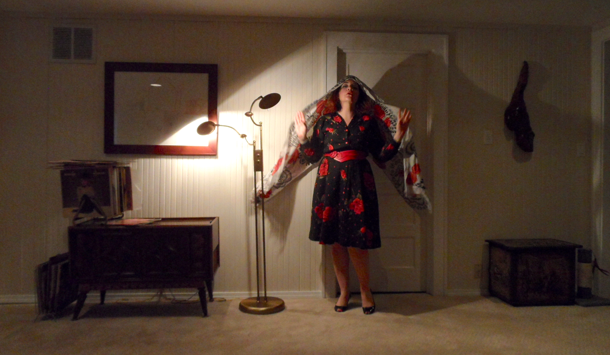 rose w/ diamond button accents – $15, Once Upon a Time antique store | Cashmere Wrappings 100% silk gray & red flower print scarf – $30, Bombshell & Blokes salon | Calvin Klein black patent leather heels – $7.99, Idaho Youth Ranch thrift store | Vicini red genuine leather geometric belt – $1.99, ReStyle thrift store