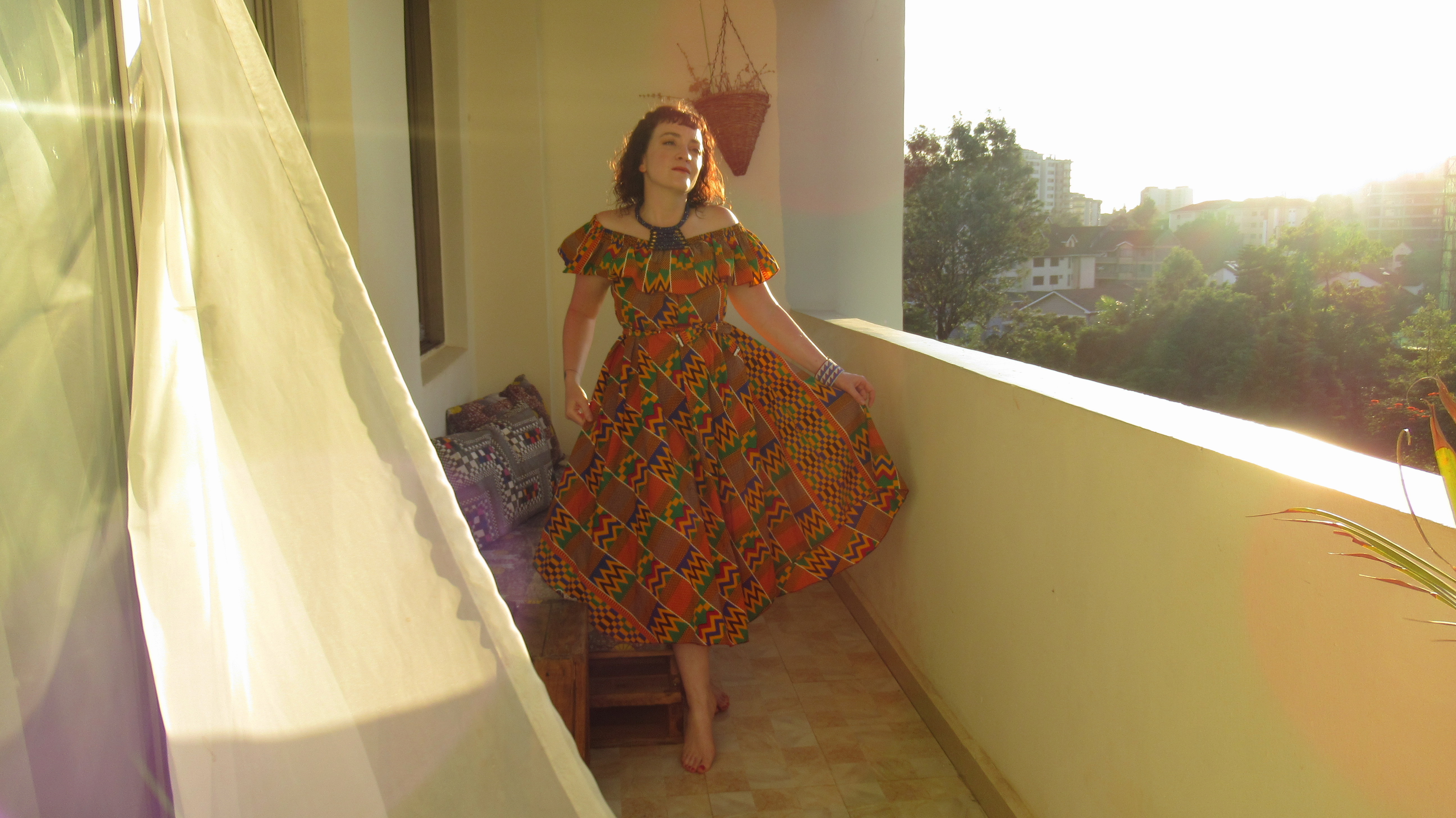 handmade African orange, yellow, blue & green print dress – $3700 Kenyan shillings (about $37) – Nairobi market | Maasai red, white & blue beaded bracelet – $2000 Kenyan shillings (about $20) | Maasai armour bijoux blue & gold beaded breastplate – $3000 Kenyan shillings (about $30)