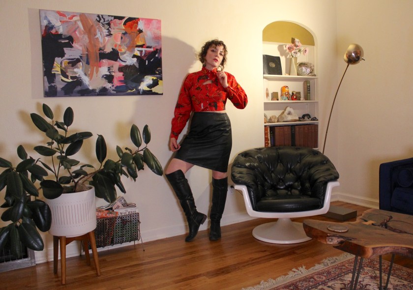 Banjo Dallas, Texas red western shirt with cowboy boots & rope pattern & gold buttons – $5.99, Idaho Youth Ranch thrift store | Maxima by Wilson black leather skirt – $7.99, Restyle thrift store | Frye knee-high black leather boots – $75, Bombshell & Blokes “head to boots” fall make-up event