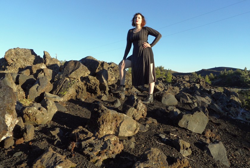 You boys that pick flowers, and strawberries, near the ground, run away from here, a cold snake lurks in the grass. — Virgil, The Eclogues I went to Craters of the Moon with Ryan last week, a surreal landscape shaped from slithering lava rising out of “the Great Rift,” now a vast stretch of scaly encrusted black. Right now I’m watching the news on the mass shooting in Las Vegas. What will stop this firepower? And what sort of warped country will it leave in its wake? BCBG Generation black & tan snake-print flap dress with built-in black spandex miniskirt – $8.95, Idaho Youth Ranch thrift store | Frye ‘Sacha Moto’ black leather shooties – $100 (MSRP: $278), Bombshell Salon‘s Head to Boots Fall Make-Up Event («the next one is THIS SATURDAY, and it’s a bad-ass party to celebrate the 5th b-day of Bombshell Salon, come! Get cheap-ass new Frye Boots!)Ryan marvels at the oddity of native Idaho creatures. Featuring, at upper right, the real moon. Cheep it up to the moon and back.