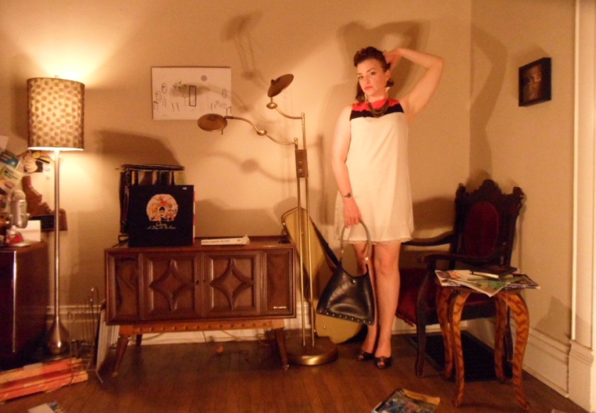 Outfit names just come to me like saintly voices to Joan of Arc. I have no choice. I do my duty—and take the designations as they come. Day at the regatta.* It sounded so yachting. So seaside seersucker East Coast-y. So gimlets** on the dock, bwah-haw-haw-ty. So then I googled it, and the image spread was somewhere between the Sports Illustrated swimsuit issue and Girls Gone Wild. I guess regattas aren’t as classy as they used to be. vintage I. Magnin & Co. buttoned up striped dress – $20, Super Fantastic Triple Yard Sale – previously sported by Boise artist Erin Cunningham (I fashion blogged about her!) | Enamel blue flame earrings – Gift, Cuba via my smuggler/friend Jeff Cramer | Steiger navy leather blue heels with brass eyelets – $7, ReStyle On side table: vintage navy leather clutch – $8, Super Fantastic Triple Yard Sale – previously sported by Danielle Hurd | Nine West cream sunglasses – Free, In Retrospect b/c they were in the lost & found bin for more than a month and I’m crafty as fuck Word guide for non-classy types: * Regatta: a sporting …
